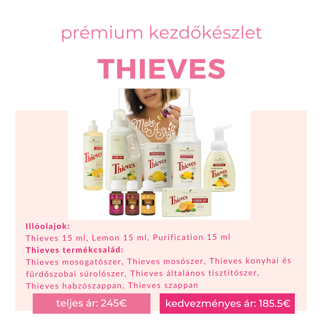 A Thieves készlet illóolaj alapú természetes tisztító- és szájápoló termékeket, 3 illóolaj keveréket és Ningxia Red-et tartalmaz.